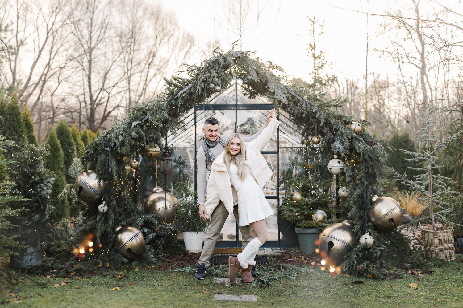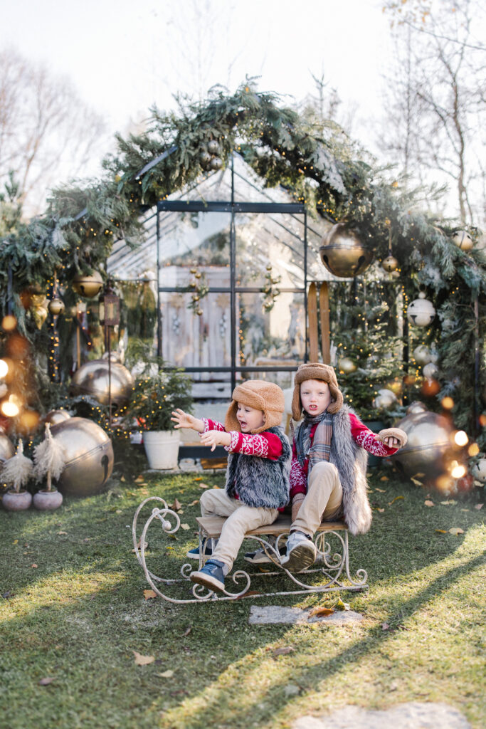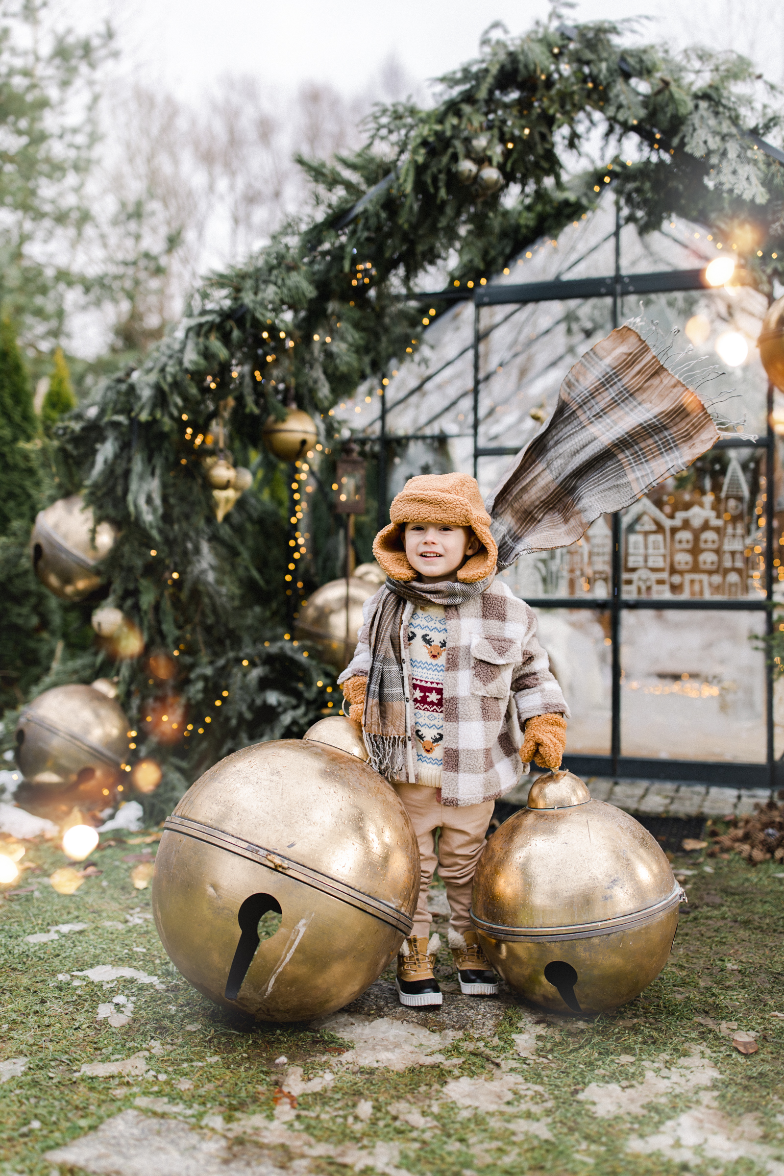 Przed wejściem do szklarni znajduje się również pergola w mojej autorskiej aranżacji – ubrana w świąteczną zieleń, girlandy, lampki i naturalne ozdoby. To właśnie tutaj zawisły gigantyczne, metalowe dzwony – mój absolutny znak rozpoznawczy i prawdziwy wow-efekt sesji w Szklarniowe Love. Nie widziałam takich nigdzie indziej w Polsce – są jedyne w swoim rodzaju i wprowadzają wyjątkowy, bajkowy klimat, który zachwyca dorosłych i dzieci.